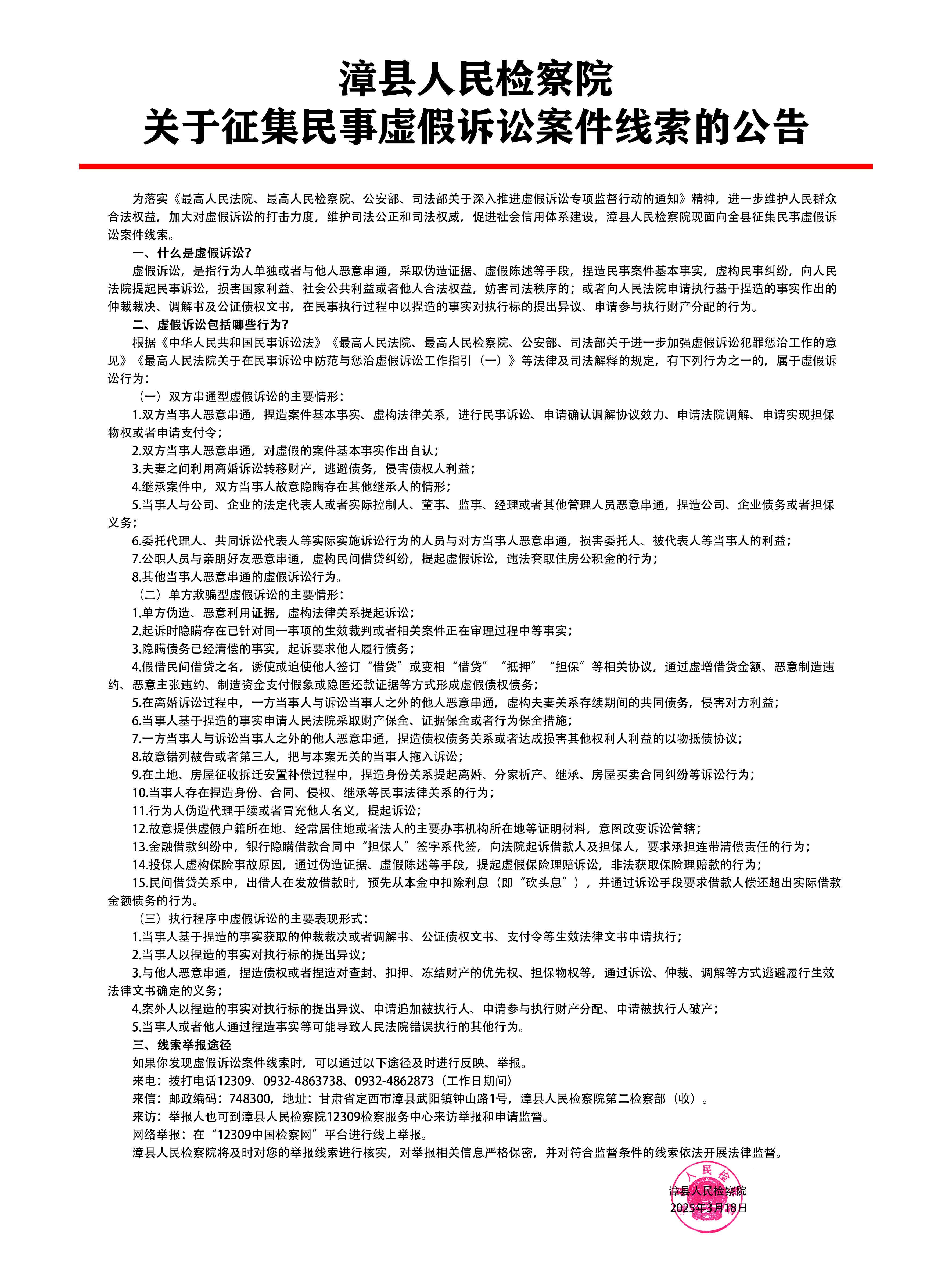 • 2025-03-18|漳縣人民檢察院關(guān)于征集民事虛假訴訟案件線索的公告